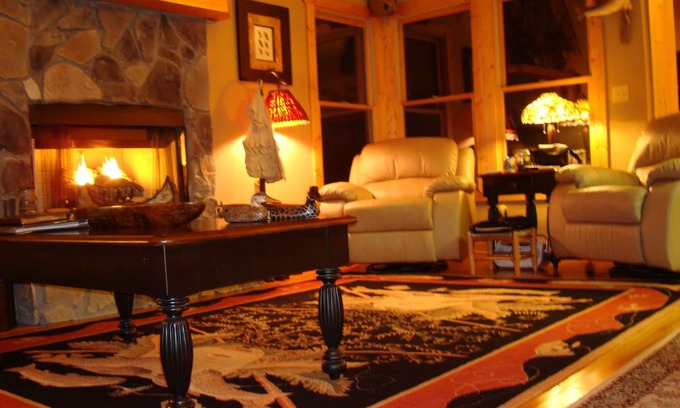 -Outdoor Sportsman Club motif in living room with gas log fireplace, huge stone fireplace to ceiling, high ceilings, executive leather furnishings with leather recliners, 36 inch TV with numerous channel lineup