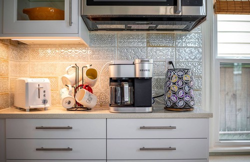 Fully equipped kitchen: gas stove, oven, microwave, drip & Keurig coffee makers, blender, and cookware