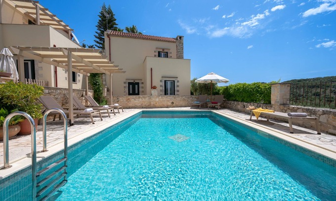 Helianthos 1 is one of three independent and beautifully designed properties within the Helianthos Villas complex. Each villa features elegant decor, a charming wrap-around terrace and access to a spacious shared swimming pool.Tucked away in the tranquil, traditional village of Douliana, this lovingly preserved hamlet invites exploration with its hidden corners and peaceful atmosphere. Located in the heart of the Apokoronas Valley and framed by the majestic White Mountains, it’s one of the most picturesque areas in all of Crete.The villa comfortably accommodates up to five guests and offers generous balconies with unobstructed views of the valley, along with a sunny terrace perfect for relaxing. The ground floor includes a cozy living and dining area with a fireplace, a sofa bed, a fully equipped open-plan kitchen, and a small WC — all adorned with traditional furnishings that add a touch of rustic charm.A set of wooden stairs leads to the upper level, where you'll find a serene double bedroom and a mezzanine with two single beds, accessible via removable wooden stairs. A spacious bathroom with a bathtub and a large veranda with stunning views of the White Mountains complete the upper floor.Guests also enjoy access to a large shared swimming pool with sunbeds , a lush garden, and several fully furnished shaded areas perfect for unwinding outdoors.The vibrant village of Vamos is just 2 km away, while Douliana itself offers a cozy square with a local café, a mini-market, and a charming taverna — all within a village of only 40 houses. Within a 10 km radius, you can explore some of the area’s most beautiful beaches, including Almirida, Kalives, Kiani Akti, and Ombrogialos.Convenient local amenities are close at hand: a mini-market just 10 meters away, a bakery 300 meters away, and several traditional taverns and cafés within a 400-meter stroll.