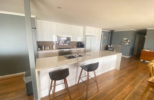 Open plan kitchen with side by side fridge/freezer, electric stove with 5 burner gas stove top, microwave, dishwasher, air fryer, electric frypan, toaster, kettle, Nutri-Bullet, mixer. Dining area with dining table/chairs, freestanding wood fire heater with bakers oven and cook top (BYO wood). Living area with split system reverse cycle air-conditioner, L shaped lounge, large smart TV, combustion heater (BYO wood).