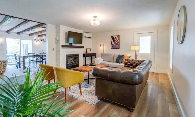 Upon arrival, you'll enter immediately into a small entryway with benches and hooks for your convenience. Walking into the main home, you'll pass through a sitting room filled with natural light. The main floor offers a convenient bedroom with a Queen size day/foldout bed and full bathroom, while the cozy living room boasts an electric fireplace, smart TV, books, and games. The open fully equipped kitchen and dining area create a spacious gathering spot suitable for all guests. Upstairs, you'll find the remaining 3 bedrooms. At the top of the stairs will be 1 bedroom with 2 twin beds and en suite bathroom. Down the hallway are two more bedrooms, 1 King and 1 Queen, both with en suite bathrooms.