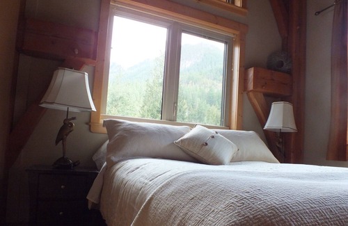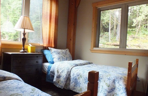 You have a choice of 3 of our four bedrooms, each with a unique configuration. You can choose the ones that best suit your needs (up to six people). The master bedroom looks out to the cove, beach and across the inlet. It has a queen size bed, skylights to watch the stars, and a private deck for two. The other queen room has views of the cove, beach and mountain. The third room, with two twin beds, looks up to the mountain on one side and out to the forest on the other. The optional fourth bedroom is a children's room with a bunk bed and easy stairs to the top bunk. It looks into the forest through windows and a skylight.