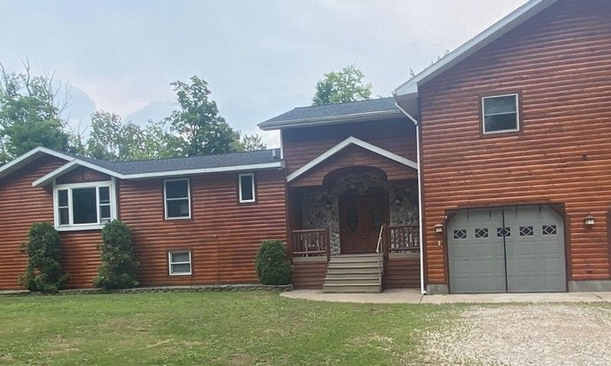Large 5 Bedroom Log Home in a secluded wooded area, Which includes a bar and game room . Close to snowmobile and ATV trails. Heated garage perfect for snowmobilers. Large deck for stargazing. Stay with us.