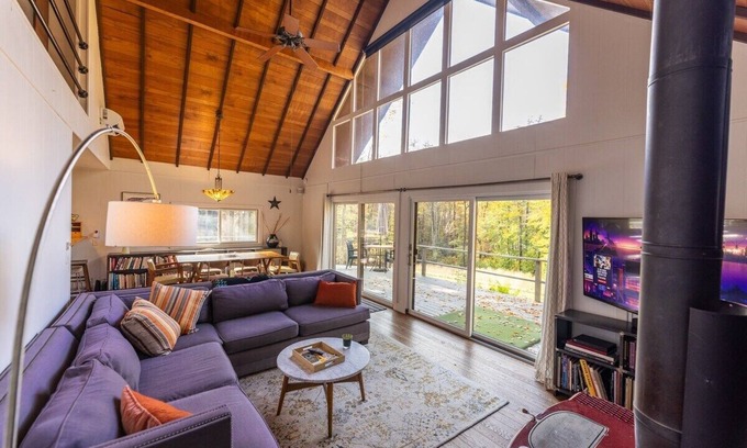 The floor-to-ceiling windows really bring the outside into this cabin. Having an open floor plan with cathedral ceilings and a spacious deck just beyond the living room make this an inviting environment for groups. A large sectional sofa faces the wood stove, woodland views, and smart TV for a combination of ultimate leisure. The downstairs closet is full of board games that will entertain the whole family. Full kitchen amenities include a gas range, dishwasher, and microwave for easy at-home cooking, and a midcentury style dining table with room to seat six.