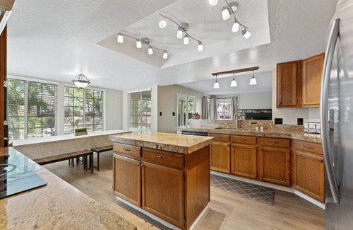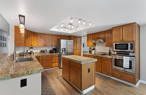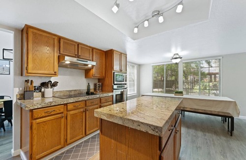 When it’s time to dine, choose between two spacious tables: a casual breakfast nook in the kitchen and a formal dining room perfect for celebratory meals. The chef’s kitchen—complete with a stove, granite countertops, and island bar—makes cooking for the group a breeze.