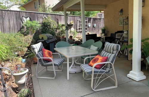 Get ready to relax in this 4-bedroom house in Cameron Park. This perfect retreat features 1 adjustable king bed, 2 queen beds, and 1 futon/office, ensuring a serene and soothing stay for all guests. With 2.5 bathrooms including a jetted bathtub and separate shower in the master bedroom, you'll have everything you need for a comfortable stay. The backyard is a large fully landscaped natuaral georgous retreat with multiple sitting areas to relax and enjoy. Book now and enjoy everything this house has to offer. This home is also ADA friendly with handles in the shower and toilet in master bedroom. There are also handrails in the front and back yard. If you are in need of a wheelchair there is a electric chair available so you would not need to bring one with you, a shower seat is also available. There is also a wheelchair lift vehicle that you may rent separately and seats 6.