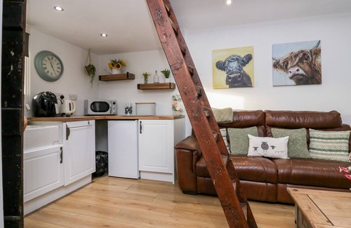 High Wreah Bolt Hole consists of an open-plan living space with a kitchen with electric hob, microwave, fridge, kettle, toaster, a dining space for two, and a sitting area with Smart TV and coal effect electric