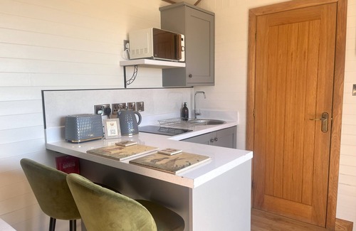 The open-plan living area is thoughtfully designed, featuring a comfy dining nook, a well-equipped kitchen, and a warming electric wood burner – perfect for curling up beside on cooler evenings. The kitchen includes a two-ring hob, microwave, and fridge with a small freezer compartment, making it easy to whip up a simple meal for two or enjoy a takeaway from nearby local restaurants.