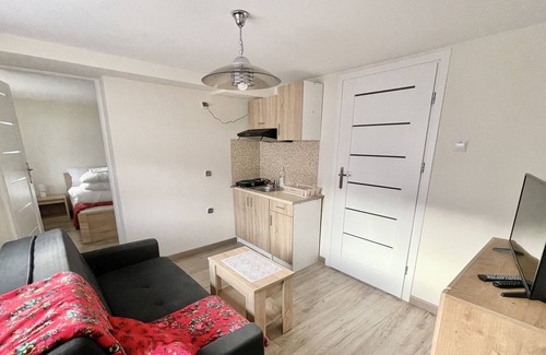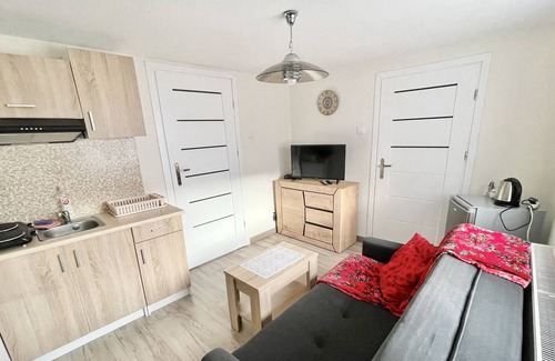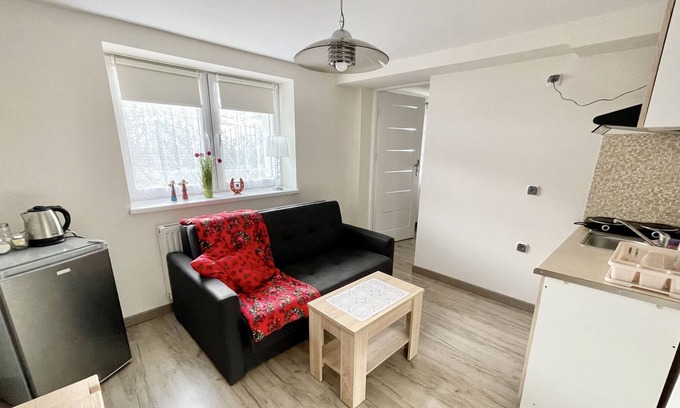 Kameralny a zarazem funkcjonalny i przytulny apartament z łazienką dla maksymalnie 4 osób urządzony z góralską nutą wyposażony w TV i WIFI. Salon zaopatrzony miedzy innymi w sofę 2 osobową z funkcją spania i w aneks kuchenny z pełnym wyposażeniem i lodówką. Sypialnia 2 osobowa, łazienka z kabiną prysznicową. Z okiem widok na ogród.