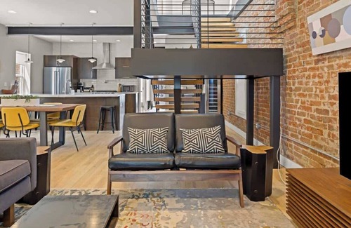 Once inside, you’ll be greeted by an open floor plan featuring exposed brick and a cozy living area perfect for relaxing after a day of exploring. If you choose to stay in, there’s plenty of room for the whole crew to lounge with a movie or a board game. The kitchen is a culinary delight, with everything you’d need to whip up something delicious.