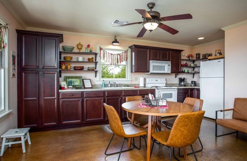 Views, wildlife, bird watching, quiet relaxation—if this is what you are looking for plus staying in an awesome, quiet cabin then this is the home for you. Hillside Cabin is located just a short distance from Honey Creek Cottage and less than 10 minutes from Fredericksburg. Honey Creek Cottage is found at the next entrance on the road and renting both will make a wonderful retreat for family and friends. Hillside Cabin is tucked in the trees enjoying the wonderful wildlife that surrounds it. This small cabin is elegant, cozy, warm and inviting. The front porch has a table and chairs plus comfy seating to enjoy the wonderful views of the countryside. In the back yard are other seating areas designed to enjoy the many birds, squirrels, deer and other wildlife that are so prevalent. Your hosts have created a wildlife refuge for guest making it a spectacular place to stay and enjoy.