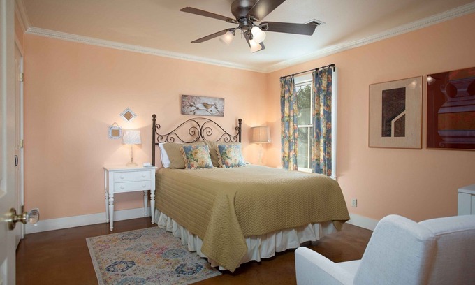 Entering into the house savor the spaciousness of the open living room and kitchen. The living area has a large comfy sofa and overstuffed chair placed to enjoy the large satellite television. Fully equipped the kitchen is both practical and elegant. And perfect for those quiet dining moments during your stay. A queen bed is the focal point of the bedroom, with it's soft coral walls. The bed is elegantly dressed with tasteful beauty and offers fluffy pillows to accent. Adjacent bathroom has a large shower.