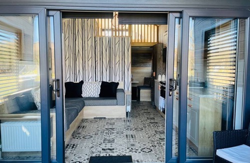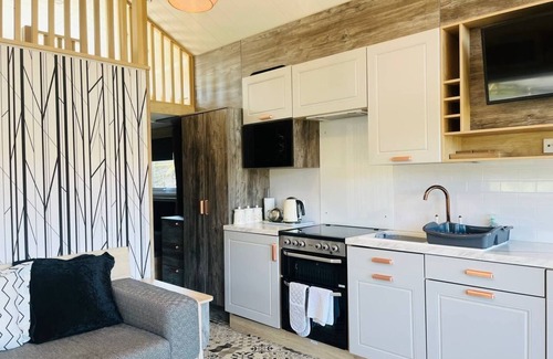 Inside, the open-plan living and kitchen area is both stylish and practical, featuring sleek light grey units with copper-finish hardware, a statement tile-effect splashback, and under-cabinet LED lighting. Whether you're preparing a quick breakfast or a family dinner, the well-equipped kitchen has you covered with an integrated microwave, under-counter fridge with freezer box, two-burner gas hob, and a full-size sink with drainer.