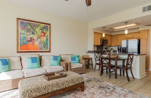 The open-concept living area offers a bright and airy space, where plantation shutters and ceiling fans create a breezy, tropical ambiance. A flat-screen smart TV ensures entertainment for cozy evenings in, while the private lanai just beyond invites guests to unwind with breathtaking ocean and resort pool views.