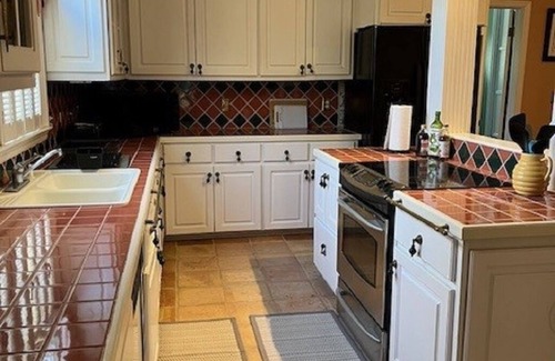 The kitchen is spacious and stocked with the basics. We have provided complimentary essentials including coffee, tea, sugar, flour, salt, oil and a variety of spices to make meal prep easy and enjoyable. There is a local grocery store just a few blocks away. The kitchen seats 6 and the adjacent dining room seats 8. The first floor also includes a cozy living room with leather furniture and an electric fireplace. There is a full bath off the kitchen and a full laundry room as well.