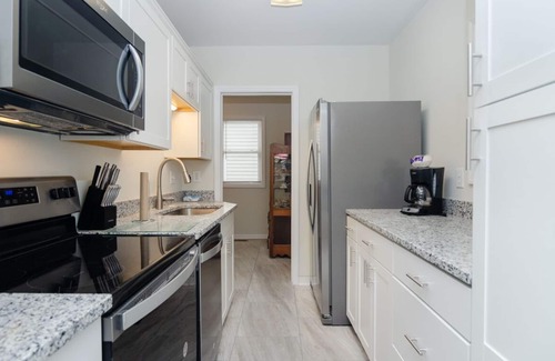 As you make your way past the living room and down the hallway towards the bedrooms, the hardwood floors are a subtle reminder of the history of this home and truly makes this property feel like “home”. The fully renovated hall bathroom features a fresh clean style, great lighting, and a large walk-in shower. A guest bedroom is across the hall and has two twin beds, a flat screen TV, and is serviced by the hallway bathroom - a great room for the younger family members of your group! The second guest bedroom is furnished with a cozy full-sized bed and has convenient access to the hall bathroom.