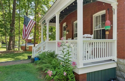 Welcome to 171 Diamond, a rare opportunity to stay in the original Surgeon’s Quarters at Fort McKinley on Great Diamond Island. This beautiful 2-bedroom, 2-bath freestanding brick home blends historic details with thoughtful modern upgrades—tin ceilings, original fireplace, a gas stove, custom window treatments, and hardwood floors.