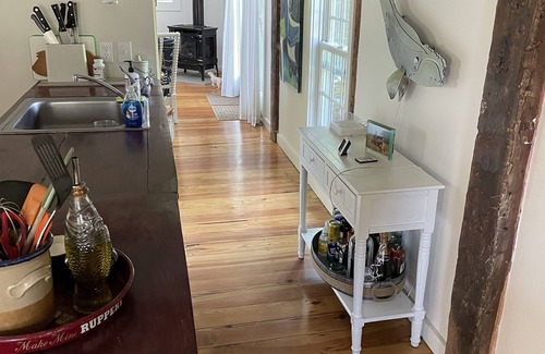 Upon entering this two floor cottage, you’ll immediately be charmed by its rustic interior, featuring original wooden beams and recently refinished original pine plank flooring throughout the cottage.