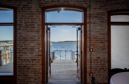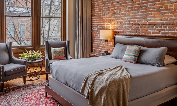 The Historic Town View room features a bay window overlooking Water Street, a comfortable king bed, and a private bath with a shower/tub. Enjoy the exposed brick and historic ambiance of the room while taking advantage of amenities such as an alarm clock, refrigerator, coffee maker, hairdryer, and USB plugs/charging station. While there are no TVs in the rooms, guests can enjoy free high-speed internet for their personal devices.