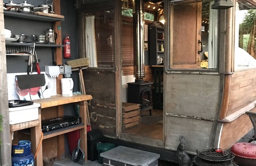 Outside under the Veranda is the kitchen with sink, shelving with all your pots and pans, bins, gas camping stove and wooden work surface. This is all under the verandha that stretches around two sides of the Tram. Led lighting for outside dining with table and chairs, bench & Small patio area for bbq in the front and rear garden where the NEW bespoke flushing loo and hot electric shower is situated about 10 feet behind the Tram in its own building.