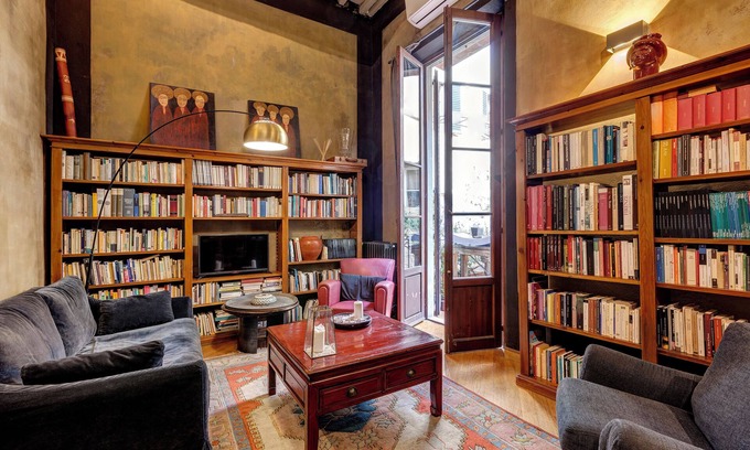 Flick through some art books from the comfort of a leather armchair by the library. This renovated apartment with a roomy exclusive terrace blends old and new, from antique ceiling frescoes to recent Pompeii-inspired paintings by a famous local artist.