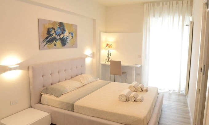 In the center. 5 minutes walk from the port. Three modern rooms finely furnished with wardrobe, bed, desk. Each room has a 32-inch LED TV, air conditioning. Two bedrooms have their own balcony. Each room has an en-suite bathroom with hairdryer. Safe in each room. Finishes of great value. Sea view terrace and solarium with wonderful views over the Gulf of Alghero. Upstairs kitchen and bathroom overlooking the terrace. The prices indicated refer to the whole house or to 6 guests
