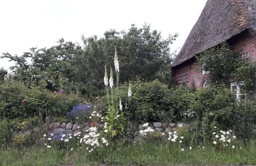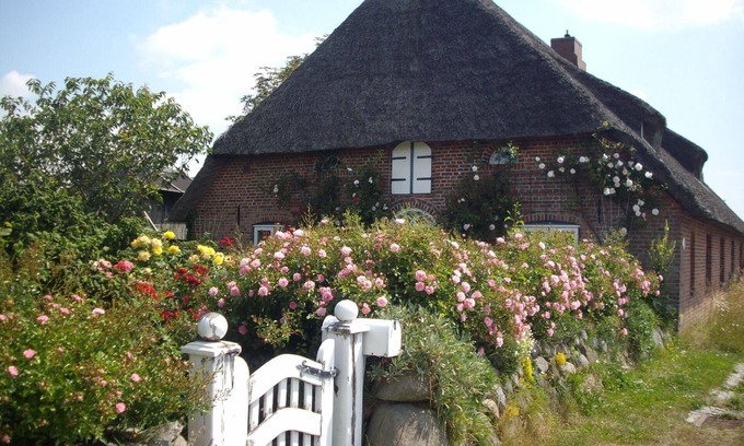 Flat in a thatched Frisian house from 1860 The holiday flat is located in quiet surroundings on an ancient summer dyke, only about 4 km from the North Sea, between the towns of Niebüll and Emmelsbüll in Südtondern in the district of Nordfriesland. You will find a fully and lovingly furnished flat on the first floor of an old thatched Frisian house dating back to 1860. Woollen blankets are also available for the cooler days. Two further sleeping possibilities are available in the living/dining room on the folding sofa bed. The fitted kitchen is equipped with all the essentials: coffee machine, toaster, microwave, 4-ring hob with oven, fridge, hand mixer, steam iron, hoover, crockery, glasses and cutlery etc. Dishes and towels are included. Crockery and towels are included. The living room is furnished with a sideboard, coffee table, round dining table with four chairs, couch, satellite TV and a radio with CD player. The bathroom/WC with shower is fully tiled. Garden furniture is available for you on the terrace in front of the house so that you can really relax. Or you can simply enjoy the sun and the endless starry sky over North Friesland in the evening. Because nothing obscures your view here, at most the clouds. A car park for your car is available directly at the house. All rooms are equipped with radiators and high-quality laminate or tiles. Two dogs are welcome. Sometimes you can hear a noise under the thatched roof; that was certainly "Nis Puk", the good invisible Frisian house spirit. The holiday flat is fully furnished in Nordic style with open beams and pine furniture. You have a wide view over the fields from all the windows. A holiday with us on the dyke is relaxation in a distinctly maritime climate - similar to that of the North Frisian islands and Halligen. The hygric influence and wind speed are somewhat weaker than on the islands and Halligen. The recreational success is primarily due to the thermal stimuli, accompanied by a high level of air purity. The maritime, stimulating climatic factors are a good prerequisite for a general increase in performance, as wind and weather provide long-lasting resilience and give you strength for your time at home. From here you have the opportunity to explore a lot: e.g. to the Baltic Sea to Flensburg 45 km, Husum 42 km, Tondern (DK) 25 km, the island of Römö (DK) with the widest sandy beach in Europe and of course the islands and Halligen. Are you an angler? There is a fishing lake just 200 metres away and a beautiful bathing lake five kilometres further on - perfect for small children. Niebüll has an indoor swimming pool for bad weather and a natural history museum for museum-goers. In Leck, the adventure pool offers variety for the whole family.