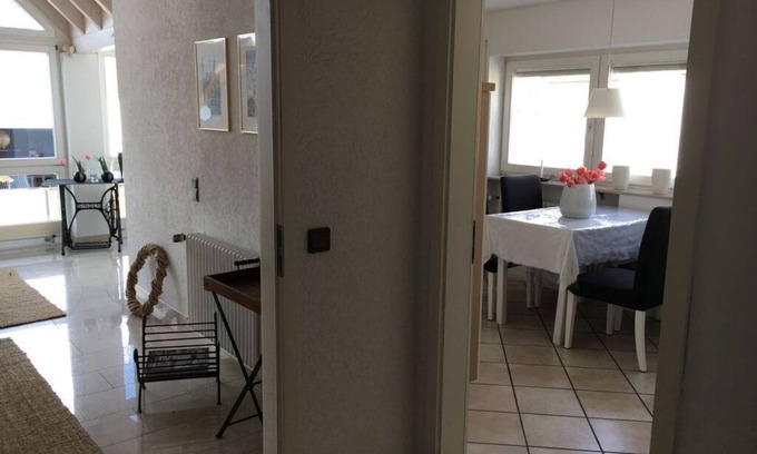 Our beautifully furnished Hochberg holiday apartment offers you a bedroom with a double bed, a bright living room/bedroom with a large dormer window and a sofa bed on approx. 63 m², as well as a fully equipped dining kitchen with a dishwasher, ceramic hob, oven, refrigerator with freezer compartment, coffee machine, kettle and toaster. Shower bath with window. The apartment has a small balcony that is equipped with a sun awning. A seating set is available. You can find more information on our homepage.