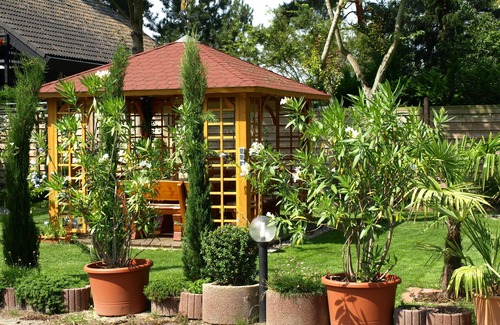 The beautiful apartment with a size of approx. 36 m² has a large living / bedroom with kitchen and bathroom. The sleeping area with a double bed and bedroom closet can be separated by a ceiling-high sliding curtain. A double bed coutch and a dining area with table and chairs are available. The small kitchen is fully equipped with a fridge, microwave, coffee maker, kettle, etc. Cable television, telephone, computer with DSL connection are available. The garden with pavilion, grill, palm trees, cypresses, oleanders has a Mediterranean flair and is reminiscent of a holiday in southern countries.