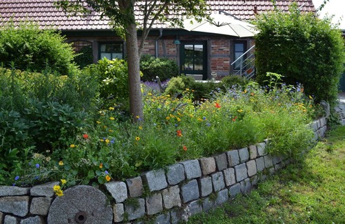 The holiday apartment is located in a detached single-family home, was renovated in 2020 and is furnished in a typical country style. The property is located at the end of a cul-de-sac road. Also due to its quiet, sunny and secluded location the domicile is popular. Available for use: parasol, sun lounger, barbecue facilities, terrace, garden furniture and campfire site.LocationSehlen. The holiday apartement is located on a 5000 sqm open garden plot with meadow, flowers, shrubs and trees. The landlord lives permanently in the house, but uses a seperate entrance. The landlord has even cats. Nature view, central island location Parking (for 1 car) is available on the property. Specialcentral heating (gas), underfloor heating.Facilities: internet access (WLAN). TV reception takes place via satellite. Dogsnot allowed. DistancesShopping 5 km, restaurant 5 km. railway station, discotheque each 1500 m. indoor swimming pool, sauna each 7 km in Samtens. Stralsund 25 km In summer: Baltic Sea (beach 15 km featuring sand and stones). horse riding in 1500 m. golf in Karnitz 5 km. tennis in Samtens 7 km. DivisionHoliday apartment, 1 floor, 2 rooms (including 1 bedroom), 45 sqm, in total 2 beds. RoomThe entrance to your holiday apartment is located on the ground floor, is at ground level and leads directly into the kitchen-diner with wardrobe and doors to all rooms. Bedroom with 1 double bed. Eat-in kitchen with sitting area, TV, radio and dining area (2 seats). Kitchen with electric stove (ceramic hob, 4 plates), oven, extractor hood, dishwasher, fridge (icebox), microwave, coffee machine, toaster and electric kettle. Bathroom with shower, 1 washbasin, WC, hairdryer and window. Terms of lease and pricesIncluded in the priceinternet access, parking place, electricity, water, final cleaning, sunloungers, bed linen (first usage), hand towels (first usage), Wireless Internet access. Deposit:EUR 100,-/object
