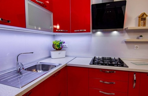 -kitchen with dinning table ( 3 rings-gas ) cooker, refrigerator with freezing section, oven, coffee machine, cooker hood, microwave, dishwasher)