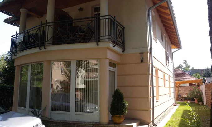 The holiday apartment is located in an apartment house and is furnished in a modern style. The property is located in a holiday home area. Also due to its sunny location the domicile is popular. Available for shared use: garden furniture.LocationSiofok. The holiday apartement is located on a 400 sqm enclosed garden plot with meadow, flowers, shrubs and trees, bordered by a fence. The landlord lives permanently in the house, but uses a seperate entrance. There are more holiday apartments in the house. Access is via a side road (asphalted). Parking (for 1 car) is available on the property. SpecialFacilities: internet access (WLAN). TV reception takes place via satellite. Dogsnot allowed. DistancesShopping 200 m, restaurant 200 m, town center 3,3 km. indoor swimming pool in Siofok 900 m. In summer: Balaton 200 m in Siofok. Beach promenade 1200 m, Plázs Beach 1700 m. Sauna, jacuzzi in Hotel Magistern**** 100 m. DivisionHoliday apartment, 1 floor, 2 rooms (including 1 bedroom), 35 sqm, in total 4 beds. RoomThe entrance to your holiday apartment is located on the 1st floor
