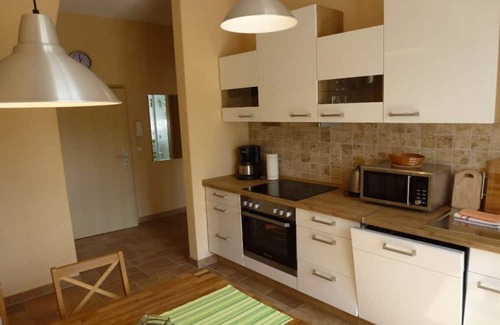 Beautiful holiday apartment with 2 separate rooms, hallway, kitchen, bathroom/WC and outdoor terrace. The apartment has been comfortably furnished and is located on the ground floor with separate access. The living room and bedroom are equipped with allergy-friendly laminate flooring and real wood furniture. Stereo system, satellite TV, DVD player and some board games are available for your entertainment. The kitchen has a modern fitted kitchen including an electric stove, microwave, refrigerator, freezer and dishwasher. The bathroom/toilet is tiled in a beautiful look. The real glass shower meets even the most demanding expectations. There is a cozy seating and barbecue area in the well-kept garden. Grill, garden furniture, etc. are available. A lockable bicycle garage and a parking space in the yard are also available to you.