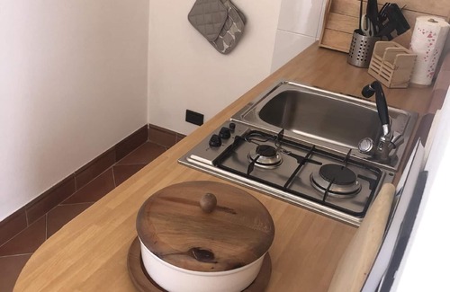 Inside, the flat, measuring approximately 20 square metres, is cleverly arranged to make the most of the available space, creating a cosy and functional environment. Although it is a studio apartment, it is equipped with everything necessary for a comfortable stay, including a practical kitchenette with a two-burner cooker and a well-organised bathroom with shower. Every element is designed to ensure a pleasant and carefree stay.