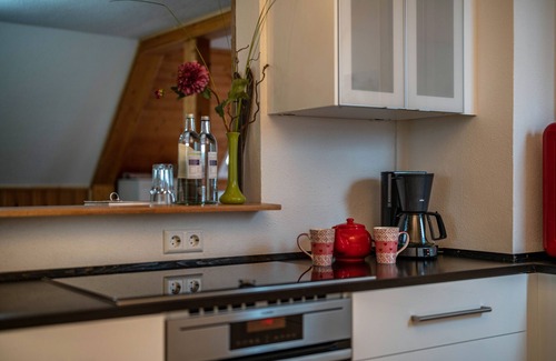 The holiday apartment was completely renovated in 2023. The living room ('Stüberl') with its extra high ceiling and wonderful view invites you to relax. The amenities include a sofa bed, a smart TV, and, if needed, two single beds. In the dining area, you will find a large dining table and a seating area by the wood-burning stove. The open kitchen is fully equipped, including an oven, induction hob, dishwasher, microwave, fridge with freezer compartment, and a separate drinks fridge. The first bedroom ('Lodge') has a comfortable double bed and offers a fantastic view of the valley. In the second bedroom, the 'Koje', two single beds are at your disposal. The low ceiling and sloping roof create a particularly cosy atmosphere. The bathroom offers a walk-in rain shower and a bathtub for relaxing. The house has its own spring, so you can enjoy your bath in fresh Black Forest spring water. During the renovation, original and restored elements were preserved and combined with Swiss pine wood.