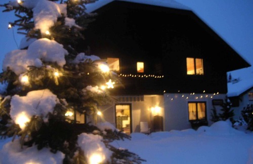 The holiday apartment is located in an apartment house and is furnished in a typical country style. Also due to the view over the mountains from the property and its quiet and sunny location the domicile is popular. Available for shared use: parasol, children's playground, swing, barbecue facilities, pavilion and garden furniture. LoLocationStrobl, district Weissenbach, 560 m above sea level. The holiday apartement is located on a 1800 sqm enclosed garden plot with meadow, flowers, shrubs and trees, bordered by a hedce. The landlord lives permanently in the house. The sleeping area is divided by a partition wall with sliding doors.