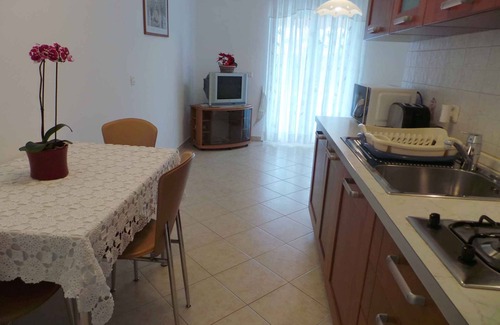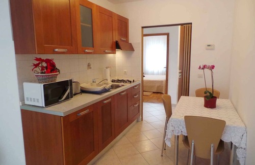 The holiday apartment is located in a single-family home and is furnished in a modern style. The property is located at the end of a cul-de-sac road. Also due to its quiet and sunny location the domicile is popular. Available for shared use: parasol, barbecue facilities and garden furniture.LocationFažana. The holiday apartement is located on a 550 sqm enclosed garden plot with meadow, flowers and shrubs. The landlord lives permanently in the house, but uses a seperate entrance. Access is via a side road (rubble or gravel). Parking is available on the street in front of the house. Specialair conditioning.Facilities: internet access (WLAN) and iron. TV reception takes place via satellite. Dogsnot allowed. DistancesShopping 300 m, restaurant 300 m, town center 300 m. Fažana: doctor, pharmacy, bank each 500 m. indoor swimming pool, sauna each 600 m. In summer: Adriatic Sea 250 m in Fažana (beach 250 m in Fažana featuring stones). tennis, mini golf, fishing, diving, boat rental each 600 m in Fažana. DivisionHoliday apartment, 1 floor, 2 rooms (including 1 bedroom), 40 sqm, in total 4 beds (including 2 additional beds). RoomThe entrance to your holiday apartment is located on the ground floor and leads over 2 steps directly into the vestibule. Bedroom with 1 double bed. Living/bedroom with 2 additional beds on couch/sofa, sitting area, TV and access to the terrace (6 sqm, covered, garden furniture). Kitchenette in the living & bedroom with dining area, gas stove (2 flames), extractor hood, dishwasher, fridge (icebox), microwave, coffee machine and electric kettle. Bathroom with shower, 1 washbasin, WC, bidet and window. Terms of lease and pricesIncluded in the priceinternet access, parking place, electricity, gas, water, final cleaning, Welcome drink, Bed linen (weekly change), Wireless Internet access. Side costs-Additionally(Payable when booking)/local tax.Costs on the spot:/On request:air conditioning 3 € per object per day.Deposit:EUR 100,-/object