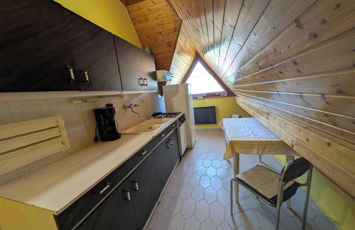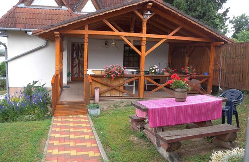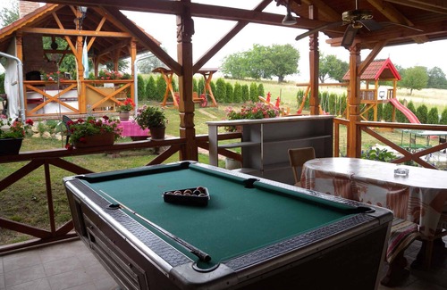 The holiday apartment is located in a single-family home built in 1995 and is furnished in a rustic style. The property is located in a residential area, on the outskirts. Also due to its quiet and sunny hillside location the domicile is popular. Available for your exclusive use: sunbathing lawn, children's playground, swing, sandpit, barbecue facilities, garden furniture and campfire site.LocationFonyód. The holiday apartement is located on a 3800 sqm enclosed garden plot with meadow, flowers, shrubs and trees, bordered by a fence. The landlord lives permanently in the house, but uses a seperate entrance. Access is via a side road (asphalted). Parking (for 6 cars) is available on the property. Specialair conditioning.Facilities: baby cot, high chair and iron. TV reception takes place via electric wire. PoolAll pools are available for shared use. Outdoor pool (usable from early April to early October, diameter 4 m, depth 1.5 m). Leisuretable tennis and billiards. Dogsallowed, EUR 20.00/pet per day. DistancesShopping 1000 m, restaurant 300 m, town center 1500 m. In summer: Balaton 1000 m in Fonyód. DivisionHoliday apartment, 2 floors, 6 rooms (including 5 bedrooms), 200 sqm, in total 13 beds (including 3 additional beds), on request additionally 1 child up to 2 years in a baby cot. RoomThe entrance to your holiday apartment is located on the ground floor and leads over the 50 sqm terrace directly into the kitchen.Ground floor: Living room with sitting area and TV. Bedroom with 2 single beds and 1 additional bed. Bedroom with 1 double bed. Kitchen with dining area (12 seats), gas stove, oven, extractor hood, fridge (icebox), coffee machine, toaster and access to the terrace. Bathroom with bathtub with shower facility, 1 washbasin, WC, bidet and window. Upper floor: Bedroom with 2 single beds and 1 additional bed. Bedroom with 1 double bed and 1 additional bed. Bedroom with 2 single beds. Kitchen with gas stove, oven, fridge (icebox) and coffee machine. Bathroom with bathtub with shower facility, 1 washbasin, bidet and window. Separate toilet with WC and window. Terms of lease and pricesIncluded in the priceOutdoor pool, babycot, parking place, electricity, gas, water, final cleaning, bed linen, pool, baby cot – please order at booking. Side costs-Costs on the spot:/Obligatory:local tax by local tariff.On request:air conditioning 10 € per room per day.Deposit:EUR 100,-/object