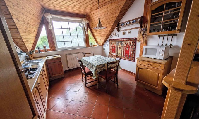 The holiday apartment is located in an apartment house and is furnished in a rustic and typical country style. The property is located on the outskirts. Also due to its quiet and secluded location the domicile is popular. Available for shared use: parasol, sun lounger, children's playground, sandpit, barbecue facilities and garden furniture.LocationKehidakustány. The holiday apartement is located on a 1500 sqm enclosed garden plot with meadow, flowers, shrubs and trees, bordered by a fence. The landlord does not live in the house or on the property. Access is via a side road (asphalted). Parking (for 1 car) is available on the property. Specialair conditioning.Facilities: baby cot, high chair, internet access (WLAN), iron, ironing board and washing machine. TV reception takes place via satellite. Shipments in German.For your safety, the accommodation is equipped with smoke detector. Leisure2 bicycles. Dogsallowed. Free of charge. DistancesShopping 1500 m, restaurant 700 m, town center 2 km. thermal bath, indoor swimming pool each 800 m in Kehidakustány. In summer: Balaton 20 km in Keszthely (beach 20 km in Keszthely). fishing in Zalacsány 4 km. horse riding in Zalaszentlaszló 6 km. DivisionHoliday apartment, 1 floor, 3 rooms (including 2 bedrooms), 110 sqm, in total 6 beds (including 2 additional beds). RoomThe entrance to your holiday apartment is located on the 1st floor