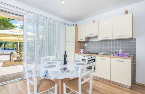The holiday apartment is located in an apartment house built in 2013 and is furnished in a modern style. The property is located at the end of a cul-de-sac road, in a residential area, on the outskirts. Also due to the view over the sea from the property and its quiet and sunny location the domicile is popular.LocationSoline, district Soline. The holiday apartement is located on a enclosed plot with trees, bordered by a fence. The landlord does not live in the house or on the property. Access is via a side road (asphalted). Parking (for 1 car) is available on the property. Specialair conditioning.Facilities: internet access (WLAN). TV reception takes place via electric wire. Dogsnot allowed. DistancesShopping 1000 m, restaurant 1000 m, town center 1000 m. In summer: Bathing possibility 500 m in Soline (beach 500 m in Soline featuring meadow, gravel, rocks and bathing plateaus). DivisionHoliday apartment, 1 floor, 2 rooms (including 1 bedroom), 30 sqm, in total 4 beds (including 2 additional beds). RoomThe entrance to your holiday apartment is located on the ground floor and leads over an external staircase directly into the hallway.Ground floor: Bedroom (6 sqm) with 1 double bed. Living/bedroom (9 sqm) with 1 additional bed on couch/sofa, sitting area, TV, dining area and access to the terrace (covered, garden furniture). Kitchen in the living & bedroom (10 sqm) with dining area, gas stove (4 flames), electric stove (4 plates), oven, extractor hood, fridge (icebox), microwave, coffee machine, electric kettle and access to the terrace. Bathroom (11 sqm) with shower, 1 washbasin, WC, hairdryer and window. 2nd floor: Anteroom. Terms of lease and pricesIncluded in the priceinternet access, air conditioning, parking place, electricity, gas, water, final cleaning, bed linen, hand towels, Wireless Internet access. Side costs-Additionally(Payable when booking)/additonal fee for short-term stays (less than 4 nights) obligatory 30% per stay. local tax.Costs on the spot:/Obligatory:registration fee 5 € per person per stay.Deposit:EUR 100,-/object