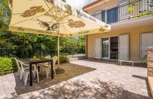 The holiday apartment is located in an apartment house built in 2013 and is furnished in a modern style. The property is located at the end of a cul-de-sac road, in a residential area, on the outskirts. Also due to the view over the sea from the property and its quiet and sunny location the domicile is popular.LocationSoline, district Soline. The holiday apartement is located on a enclosed plot with trees, bordered by a fence. The landlord does not live in the house or on the property. Access is via a side road (asphalted). Parking (for 1 car) is available on the property. Specialair conditioning.Facilities: internet access (WLAN). TV reception takes place via electric wire. Dogsnot allowed. DistancesShopping 500 m, restaurant 1000 m, town center 1000 m. In summer: Bathing possibility 500 m in Soline (beach 500 m in Soline featuring meadow, gravel, rocks and bathing plateaus). DivisionHoliday apartment, 1 floor, 3 rooms (including 2 bedrooms), 60 sqm, in total 4 beds. RoomThe entrance to your holiday apartment is located on the ground floor and leads over an external staircase directly into the hallway.1st floor: Bedroom with 1 double bed. Bedroom (6 sqm) with 1 double bed. Living/bedroom (9 sqm) with sitting area, TV, dining area and (covered, garden furniture). Kitchen in the living & bedroom (10 sqm) with dining area, gas stove (4 flames), electric stove (4 plates), oven, extractor hood, fridge (icebox), coffee machine and electric kettle. Bathroom (11 sqm) with shower, 1 washbasin, WC, hairdryer and window. 2nd floor: Anteroom. Terms of lease and pricesIncluded in the priceinternet access, air conditioning, parking place, electricity, gas, water, final cleaning, bed linen, hand towels, Wireless Internet access. Side costs-Additionally(Payable when booking)/additonal fee for short-term stays (less than 4 nights) obligatory 30% per stay. local tax.Costs on the spot:/Obligatory:registration fee 5 € per person per stay.Deposit:EUR 100,-/object