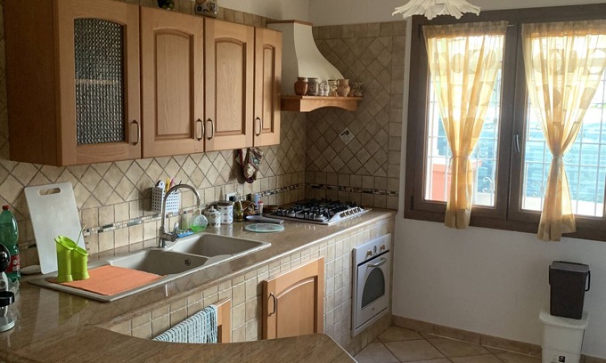 The holiday home Casa Indipendente Capoterra is located in Capoterra and impresses guests with its view of the mountain. The 110 m² property consists of a living room, a well-equipped kitchen, 2 bedrooms and 1 bathroom and can therefore accommodate 5 people. Additional amenities include Wi-Fi, a TV, air conditioning as well as a washing machine.