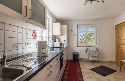 The holiday home "Der Lachenbuckhof" comprises 16 hectares of land and was built in 1937 as a resettlement farm of Fützen, a suburb of Blumberg. The 160 m2 property is located in the middle of the countryside near the German-Swiss border and offers you a holiday full of relaxation in a gorgeous solitary location. The holiday home has a living room, a well-equipped kitchen, 4 bedrooms, 2 bathrooms (both with shower and one additionally with bathtub) and can accommodate 9 people. Amenities also include a Satellite TV and a washing machine. A children's high chair and baby cot can be reserved directly from the host. Toys and children's books can be provided upon request.