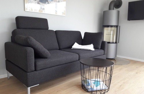 Upstairs are the fully equipped kitchenette with 4-ring electric hob, oven and dishwasher and an American fridge with ice maker and water dispenser. From the cozy sitting area you have a great panoramic view of the dunes, sea and Fehmarnsund bridge.