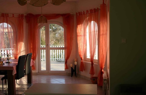 Sights also explain the popularity of Cserszegtomaj Access is via a side road. Parking (for 4 cars) is available on the property. Specialair conditioning, central heating (gas).Facilities: high chair, internet access (WLAN), iron and washing machine. TV reception takes place via satellite. PoolAll pools are available for exclusive use. Outdoor pool (usable from mid March to end of October, 3,5 m x 9,3 m, depth 1,4 m). Dogsnot allowed. DistancesShopping 800 m, restaurant 2,4 km, town center 1200 m. thermal bath, indoor swimming pool, sauna each 4,5 km in Heviz. railway station, bank each 4,5 km in Keszthely. airport in Sarmalek 16 km. Main road 800 m. In summer: Balaton 8 km in Gyenesdiás (beach 7 km in Keszthely featuring meadow and sand). horse riding in Cserszegtomaj 2 km. DivisionHoliday home, 3 floors, 6 rooms (including 3 bedrooms), 170 sqm, in total 8 beds. RoomThe entrance to your holiday home is covered and at ground level and leads directly into the hallway.Ground floor: Living room with TV, stereo system, dining area (6 seats) and access to the terrace (garden furniture, 1 table, 4 chairs). Bedroom with 1 double bed and 1 single bed. Kitchen with TV, electric stove (ceramic hob), oven, dishwasher, fridge, microwave, coffee machine, toaster, electric kettle and access to the terrace. Higher ground floor: Living room with TV, stereo system, dining area (6 seats) and access to the balcony (covered, garden furniture, 1 table, 4 chairs). Bedroom with 1 double bed. Kitchen with TV, electric stove (ceramic hob), oven, dishwasher, fridge (icebox), microwave, coffee machine, toaster, electric kettle, washing machine and access to the terrace. Bathroom with shower, 1 washbasin, WC and hairdryer. Lower floor: Bathroom with shower, 1 washbasin, WC and hairdryer. Upper floor: Living room with TV, stereo system, dining area (4 seats) and access to the balcony (covered, garden furniture, 1 table, 4 chairs). Bedroom with 1 double bed and 1 single bed. Kitchen with TV, electric stove, oven, fridge, microwave, coffee machine, toaster, electric kettle and access to the terrace. Bathroom with shower, 1 washbasin, WC and hairdryer. Terms of lease and pricesIncluded in the priceOutdoor pool, internet access, air conditioning, electricity, water, bed linen, hand towels, pool, sunloungers, Wireless Internet access. Side costs-Additionally(Payable when booking)/final cleaning obligatory 100 € per object per stay.Costs on the spot:/Obligatory:local tax by local tariff.Deposit:EUR 300,-/object.