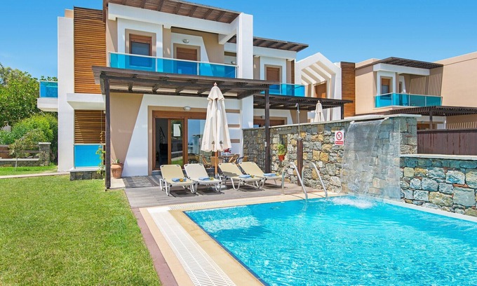 Four tasteful semi-detached houses with a private pool in a top location: only a 40 meter wide strip of grass separates you from the 10 kilometer long sand/pebble beach of Kiotari, in the southeast of the island. Enjoy uninterrupted views of the horizon and the azure sea. The private garden features a refreshing swimming pool with a waterfall and hydromassage, as well as a furnished terrace with a barbecue grill. Here you can relax and listen to the sound of the sea. The three-story houses are comfortably furnished and leave little to be desired. Within a radius of 500 meters you will find several taverns, two supermarkets and a pastry shop. Kiotari with other shops and taverns is 750 meters away. Mobility: Not suitable for people with limited mobility