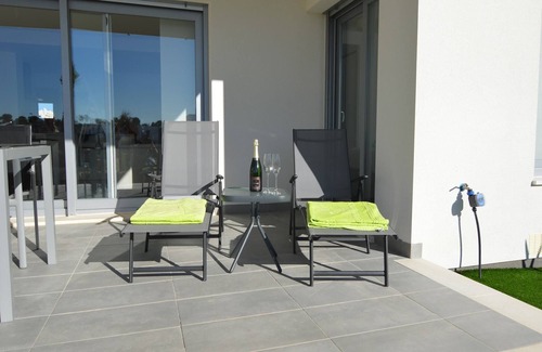 Layout: Living room(dining table), open kitchen(cooker(4 ring stoves, ceramic), coffee machine, oven, dishwasher, fridge-freezer, washing machine), bedroom(2x single bed(90 x 190 cm)), bedroom(2x single bed(90 x 190 cm)), Bedroom with bathroom(double bed(160 x 200 cm), shower, washbasin, toilet), bathroom(shower, washbasin, toilet), air conditioning, terrace(private), garden, garden furniture, sun loungers, swimming pool(shared with other guests, fenced, including part for children (depth 50cm), 20 x 10 m.), boules court