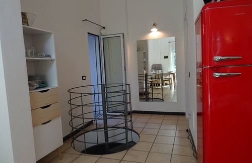 Casa Camillo is located on the edge of the village Trincheri and is colorfully decorated in the retro style of the 50s/60s, harmoniously integrated into the small village. The house offers a beautiful view of the olive grove. On each floor of the modern house, you will find a living room, a bedroom, and a bathroom. Each floor is accessible via a separate entrance, and inside the floors are connected by an elegant iron spiral staircase.