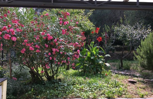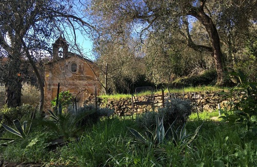 The terrace under the large glass roof is a wonderful place to enjoy the sun, dine outdoors, or barbecue—even when it rains. The large natural garden offers many idyllic spots, including a barbecue area under the mulberry tree and a seating area with a view of the small chapel and the village street. From the garden, you enjoy a fantastic view of the mountains and the sea (6 km as the crow flies).