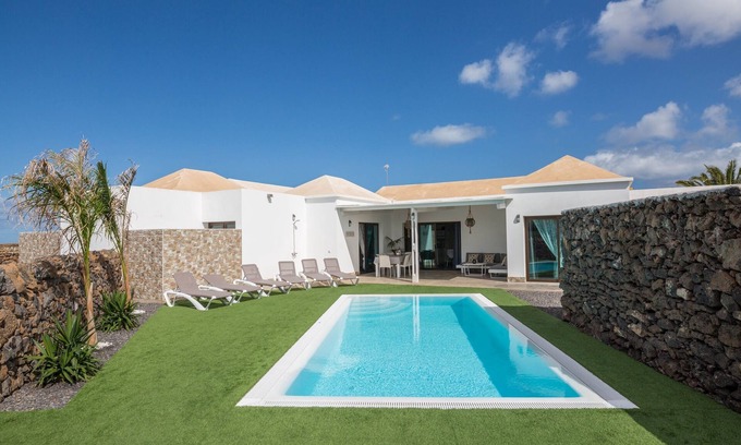 The charming “Villa Era 1” is located in the urbanization El Roque next to El Cotillo, Fuerteventura, and it impresses guests with its spacious shared outdoor area and its beautifully-decorated interiors. It consists of a living room (with a sofa bed), a fully-equipped kitchen with a dishwasher, 3 bedrooms (one with 2 single beds, 2 with a queensize bed), as well as 2 bathrooms, and can therefore accommodate 8 people. Additional amenities include Wi-Fi, fans, a television, a baby cot, a children's bed and a highchair. One of the highlights of the property is its charming, outdoor area, where you will find a private pool surrounded by sun loungers, 2 barbecues and a covered terrace with a dining area and a lounge area where you can relax with a glass of wine in the evening. You will find a wide selection of shops, restaurants, bars and cafes, as well as the closest beach, Playa de los Lagos, in the village El Cotillo, which is just a 5-minute drive away (2km). Guests can also visit the Calderón Hondo (25minutes driving, 10.8km) or the water park Acua, especially if they are traveling with children (20 minutes by car; 18.2km). The airport of the island can be reached after 41 minutes driving (43.7km).